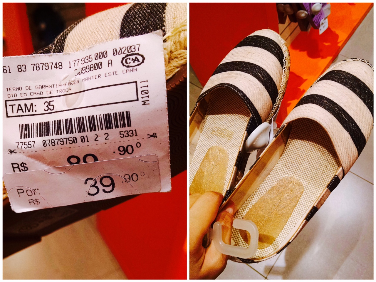“Oi, Ana! Tudo bom? Sempre acompanho seu blog apesar de não comentar muito por aqui, e admiro seu trabalho 😀 dei uma voltinha na praça Saens Peña – Rio e resolvi olhar a c&a de lá, já que as promoções boas estão rolando agora em janeiro. Achei essa alpargata da coleção água de coco com um descontão de 89,90 por 39,90. Fica a dica pras cariocas hahaha”