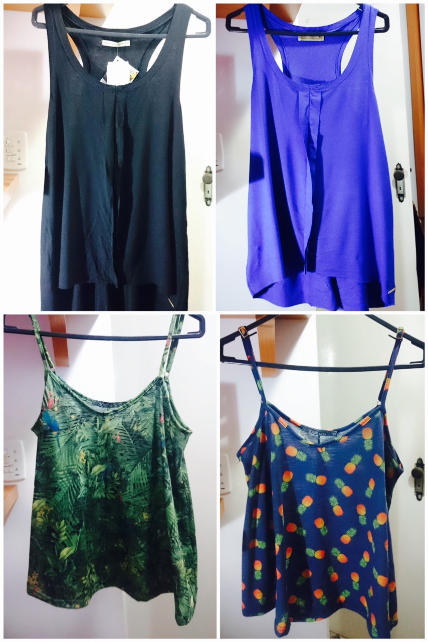 E duas da Malwee, uma azul outra preta, deliciosas, algodão, tamanh1234romoção: Metade do preço! De 59,99 por 29,99. Levei duas pelo preço de uma. Mesmo Shopping. Bacana que são mullets, dá até pra usar com legging e cobrir esse meu derriere de mais de metro. Hahaha Já viraram meu uniforme de trabalho : )”