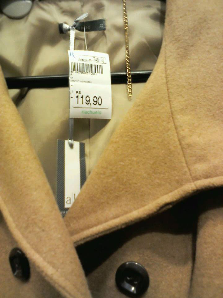 “Olá querida Ana!! Essa semana vi no blog que vc está louca pelas remarcações e ontem quando estava na Riachuelo de Duque de Caxias (Baixada Fluminense) me deparei com esse casaco e lembrei na hora de vc! Remarcado por R$ 10 a menos do que vc disse que estava disposta a pagar!! Incrível como as lojas de departamento cobram tão caro em determinadas peças pra depois fazer essa queda de preço. É por isso que atualmente até me desanimo de comprar nelas, pois as vezes pagamos tão caro por algo e algum tempo depois a peça passa a custar menos da metade do preço. Triste realidade brasileira né…”