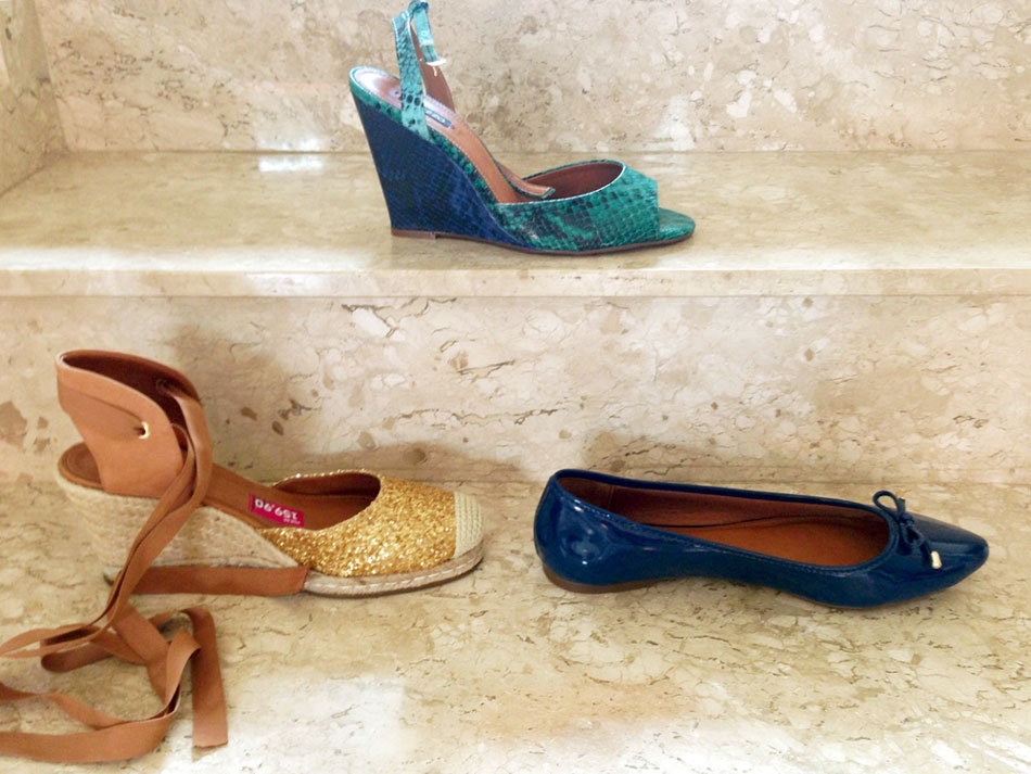 Vamos às aquisições: paguei R$ 110 na espadrille dourada (virou meu calçado preferido pro verão), R$ 65 na sapatilha azul de bico fino e R$ 120 na anabela de cobra em tom de verde com azul. A minha mãe também aproveitou e levou para casa o scarpin azul de nobuck por R$ 100. Beijos!”