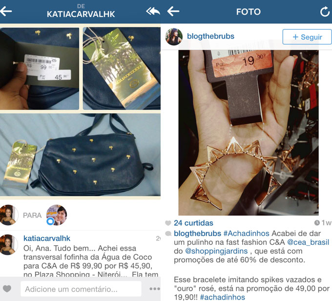 A Kátia conseguiu uma bolsa remarcada da coleção Água de Coco para C&A por 45,90 e a @blogthebrubs deu a dica das bijus do Shopping Jardins com até 60% de desconto!