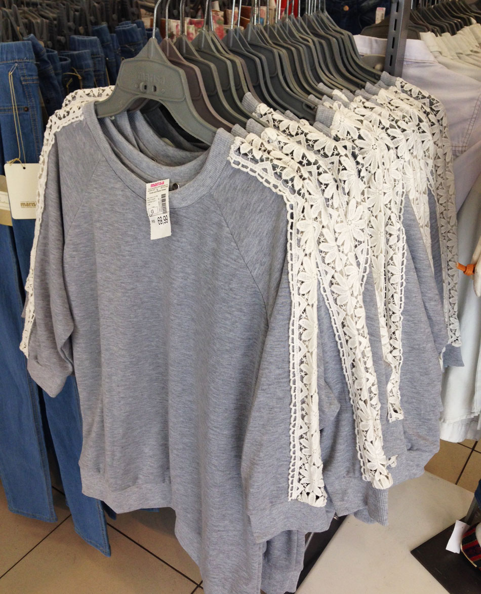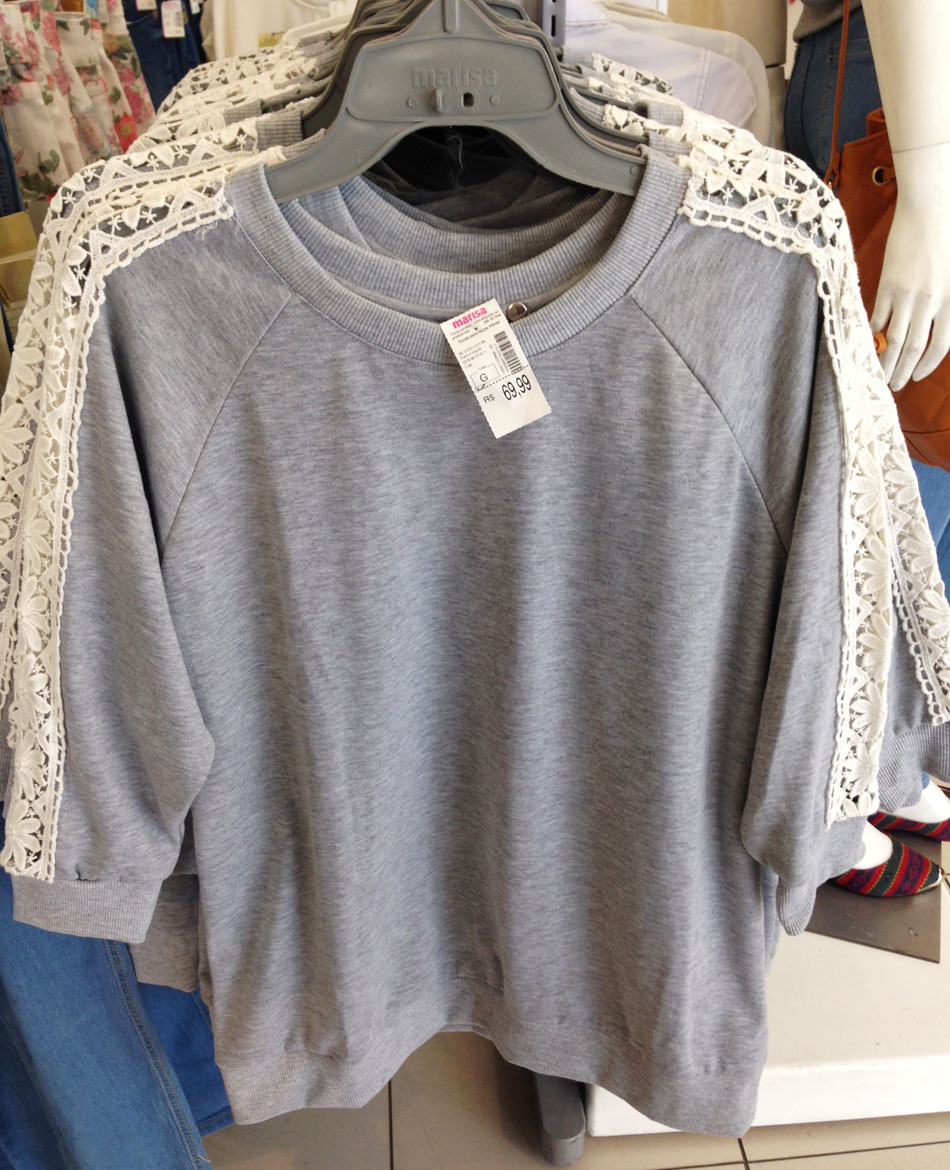 Aí em SP eu dei um giro rápido na Marisa da Teodoro Sampaio e vi esse moletom mais arrumadinho, com renda vazada nas mangas! Não é muito fino nem muito grosso, o que achei bom pro Rio, mas ruim para quem mora em cidades mais frias. Custa 69,99!