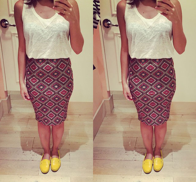 “Saia lápis super linda na Forever 21!! Tem outras estampas também, e o preço é super bom R$34,90. Tem também o mesmo modelo com listras!!”