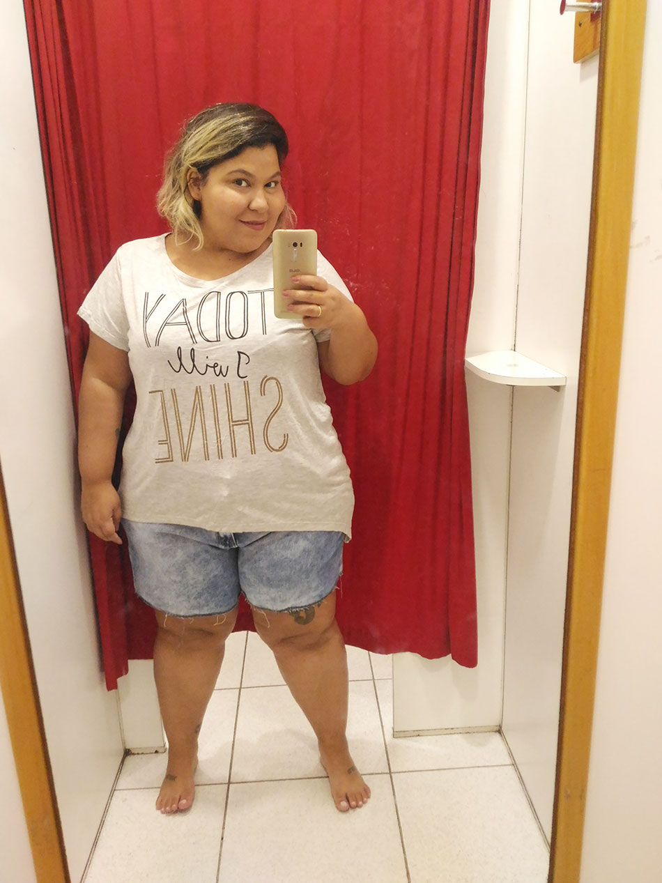 Achei essa camiseta um arraso. Peça curinga, vai bem com shortinho, calça jeans ou legging. É fresca, tem a malha fininha e gostosa, além de ser super confortável. O short tem uma pegada destroyed, sem costura na bainha. Como eu sou uma gorda de quadril muito mais largo que a cintura, sempre preciso fazer pence pra não ficar com o cofrinho à mostra, haha. Além disso, ser baixinha faz com que os shorts fiquem compridos em mim, daí sempre dou uma encurtada básico. Nesse não precisaria, achei o comprimento ótimo para o meu tamanho.