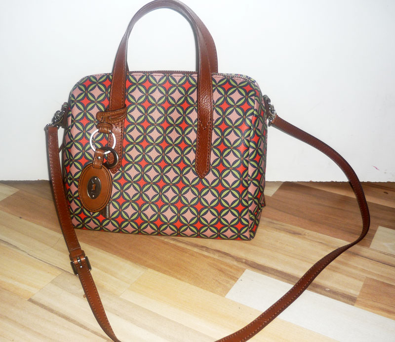 “Oi Ana, olha só que achadão… Encontrei essa bolsa da Fossil (marca americana que é famosa pelos relógios) que custava 119€ e estava por 24,99€, é isso mesmo fiquei passada! Ela é um bauzinho tipo a Speedy da Louis Vuitton e tem o mesmo material, estrutura em lona e alças em couro natural! Colorida e linda! Nem acreditei quando vi o preço e lógico que veio morar comigo hehehehehe. Estou em Love! A bolsa foi comprada na Alemanha.”