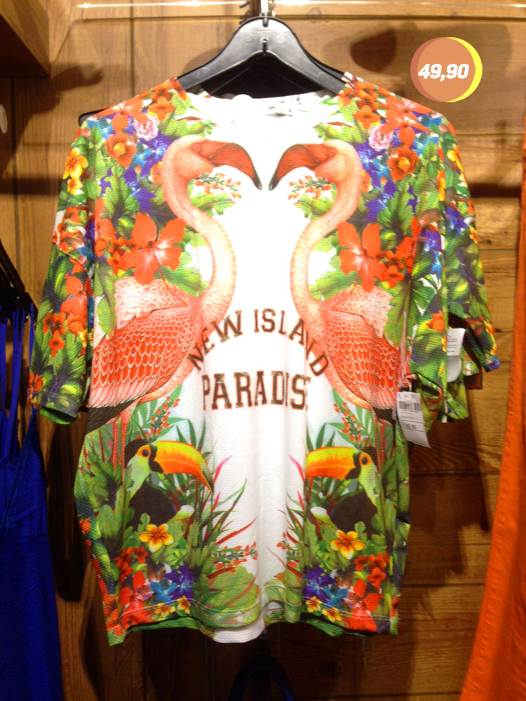 As lojas ainda não esgotaram seu repertório de flamingos, que continuam bombando em conjunto com as estampas espelhadas, rs. Apesar de estar meio cansada desse combo, achei essa blusa simpática e com um preço bom! 🙂