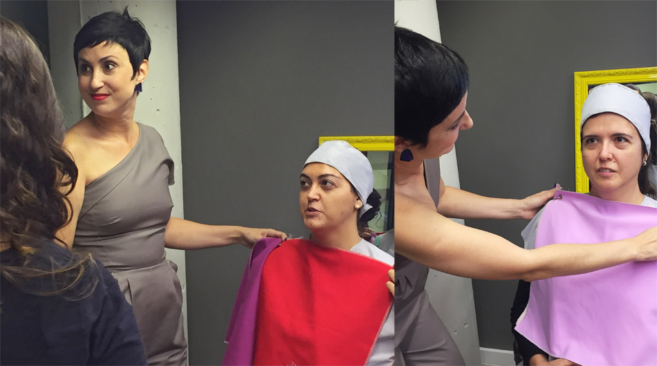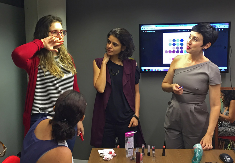 Depois de vários exemplos e muita teoria, fomos pra prática e partimos pro teste dos batons! Fizemos testes como esse aí da foto, passando o batom nos dedos para colocar em frente à boca e perceber os que ficavam mais integrados às cores e contrastes de cada uma. Sabe aquele batom que você não consegue usar de jeito nenhum? Pois é, esse teste pode te ajudar a perceber se ele fica harmônico com suas cores ou se está deslocado demais. 🙂