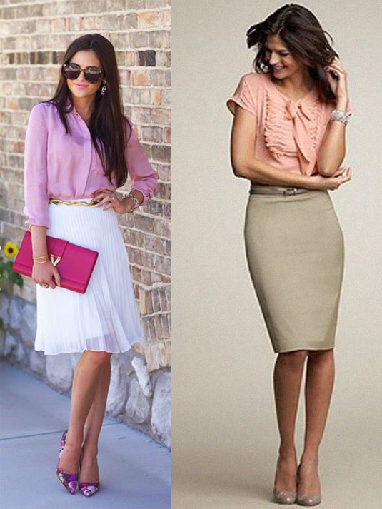 3) Saindo das calças e indo para as saias, shorts ou bermudas, que podem ter as cores mais coloridas como o azul que propus aí em cima ou para a família dos neutros, como branco, verde oliva e bege! Saia lápis fica mais clássico, saia plissada com scarpin floral fica ultra feminino-poder! Mistura de estampas sem ficar over com a texturinha da saia 🙂