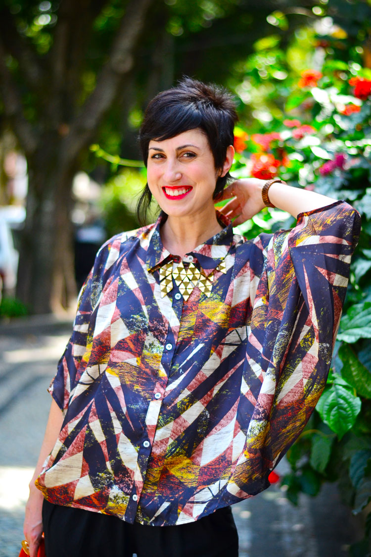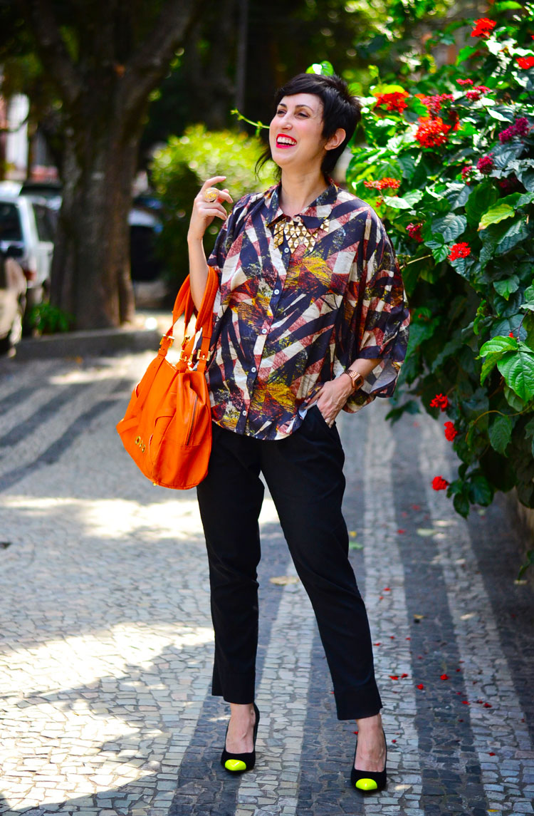 Culpa dessa blusa moderninha-hipster que comprei no passeio às lojas de fábrica e da felicidade de ter coordenado mais uma produção com essa bolsa laranja. Adorei tudo, minha gente. As nossas decisões poderiam ser mais simples, né? hahaha