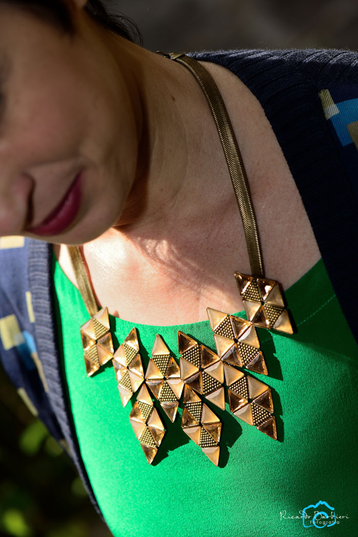 O arremate final ficou por conta do colar dourado, que obviamente fica próximo ao rosto e assim ilumina ainda mais, deixando o casaquinho como um complemento elegante. Ufa! 🙂 Consegui um look que eu realmente gostasse com ele!
