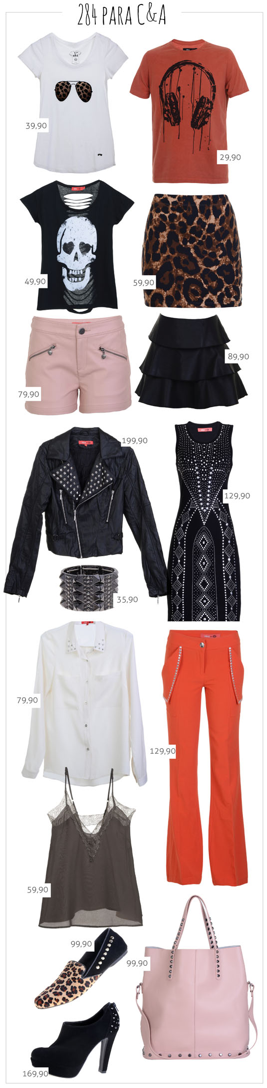A C&A divulgou algumas imagens da sua coleção em parceria com a 284. Serão 106 modelos entre roupas, calçados e acessórios, com preços que variam entre R$ 12,90 (brinco) à R$ 199,00 (jaqueta de couro fake e tachas). A coleção estará disponível em 70 lojas da rede, a partir de 26 de fevereiro de 2013.