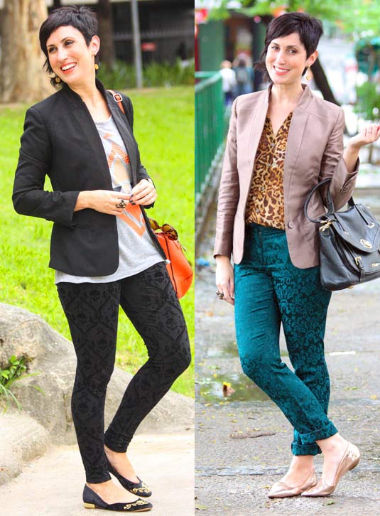 Outro truque que adoro é coordenar estampa com textura! Fica um mix mais discreto, como se fosse um detalhe a mais sem ser tão escandaloso, hehe. Nos dois looks abaixo temos a proposta de t-shirt com estampa e legging texturizada em veludo e blusa de oncinha com desenhos barrocos na calça.