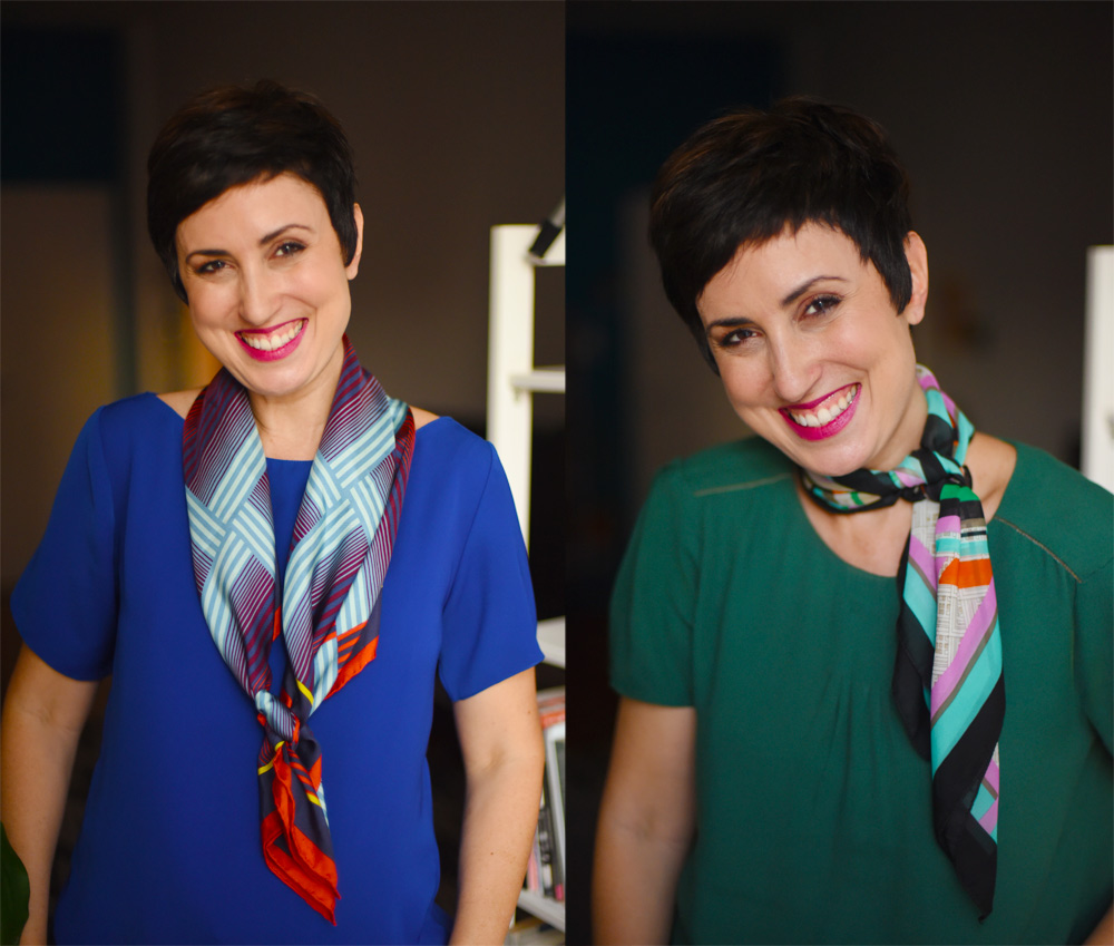 Ó nas fotos abaixo como eu fiz essa ligação entre a cor da blusa e dos lenços! 🙂 Na blusa azul eu escolhi um lenço que tivesse tons azuis (quase no tom sobre tom) para ajudar na harmonia. Na blusa verde eu ousei um pouco mais, mas repara como tem um verdinho ali perto do nó, vai! Hahahaha!