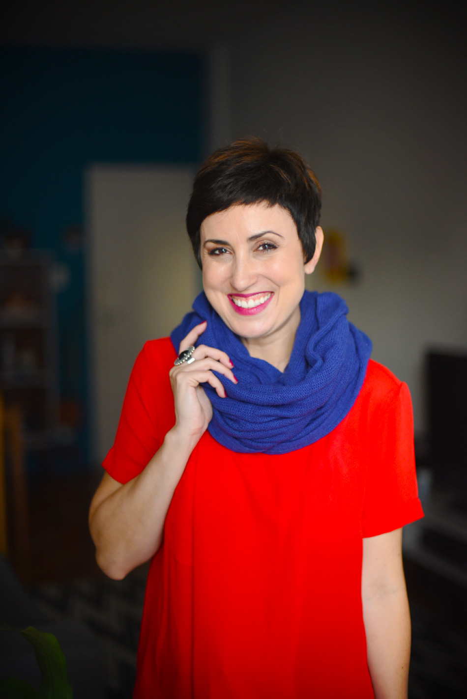 Nessa foto eu joguei com as cores primárias, a blusa vermelha com a gola azul, o que resultou numa combinação mais impactante e criativa por conta do contraste entre elas.