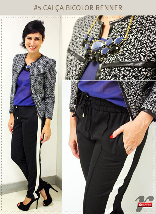 Número 5: Calça bicolor esportiva da Renner. No dia que fotografei esses looks pro blog da Renner, não estava podendo gastar e não levei. Estou sonhando com ela agora, mas se eu puder encontrar remarcada, meu amor vai ser maior. Custa 89,90, já vi remarcada na loja virtual por 39,90 mas não tinha meu número. 🙁