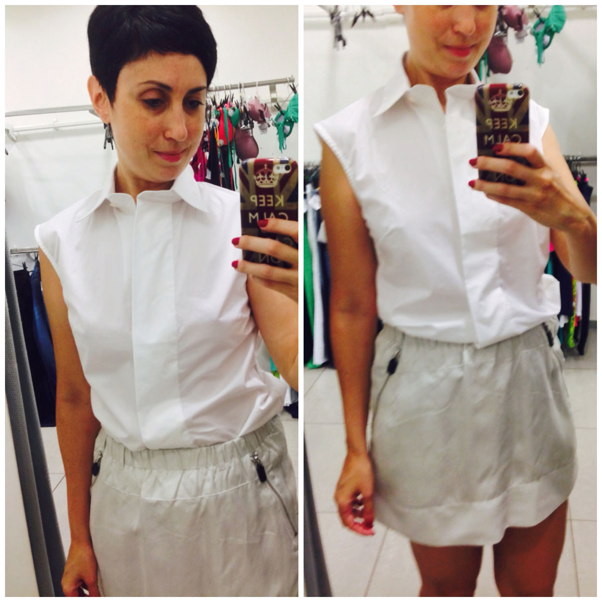 O corte dessa camisa branca sem mangas é interessante, só acheio feio esse elástico nas magas de acabamento. Achei bonito o detalhe que esconde os botões – e é de algodão! A saia modelo esportivo é bonitinha, mas nada UAU.