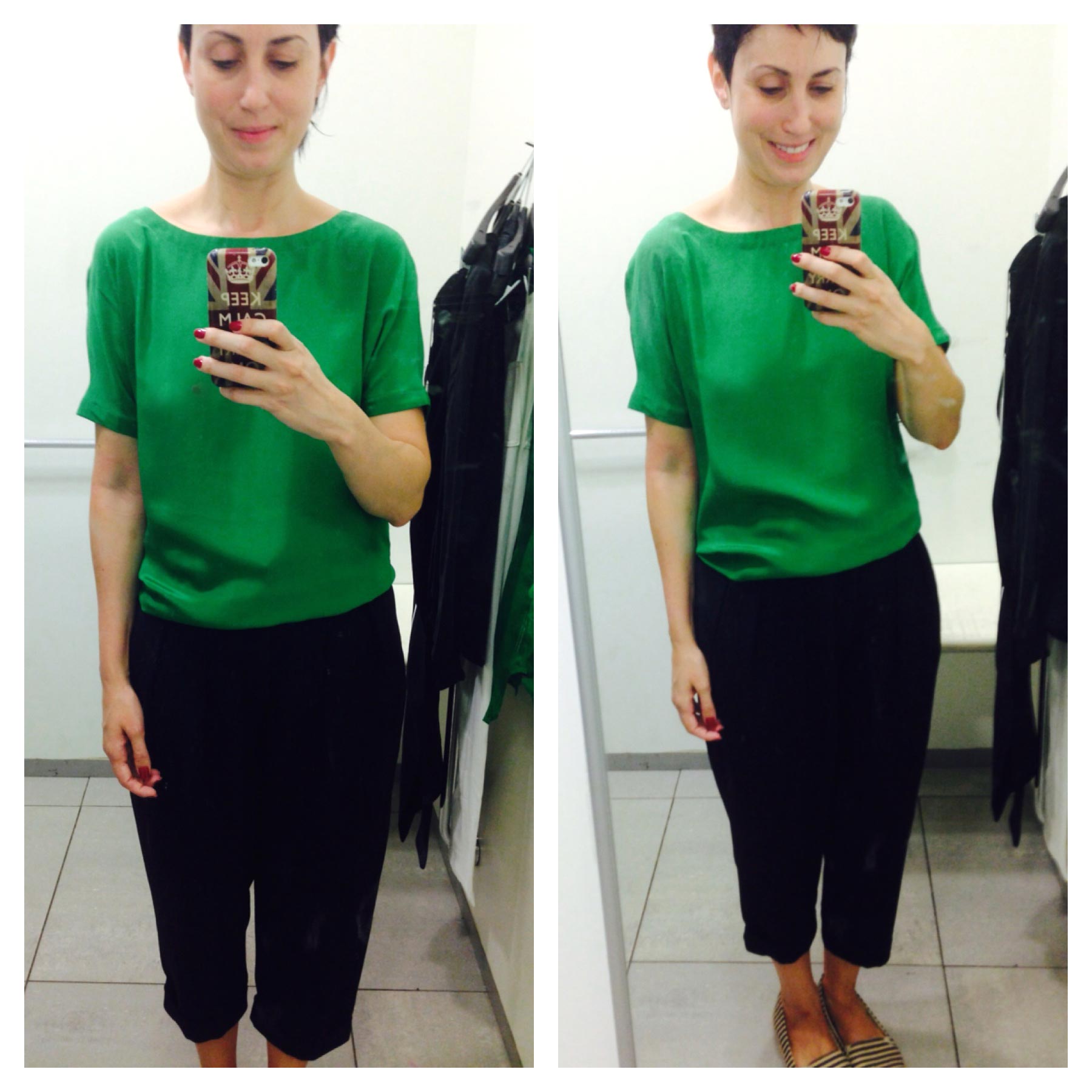 A moral da história é que saí de lá com raivinha de você. Primeiro, porque gostei de tudo, das cores,dos tecidos, da modelagem – adeus, detox!- e, segundo, porque a sua blusa verde não estava lá. Que maldade! Mas como tinha tanta coisa lá, esqueci a mágoa do verde e peguei um jeans sequinho e uma sapatilha cinza. O jeans é bacana, apesar de o zíper na barra me dar uma certa coceira na canela, e a sapatilha é delícia, com um dia de uso já laceou e é uma séria candidata a uniforme.