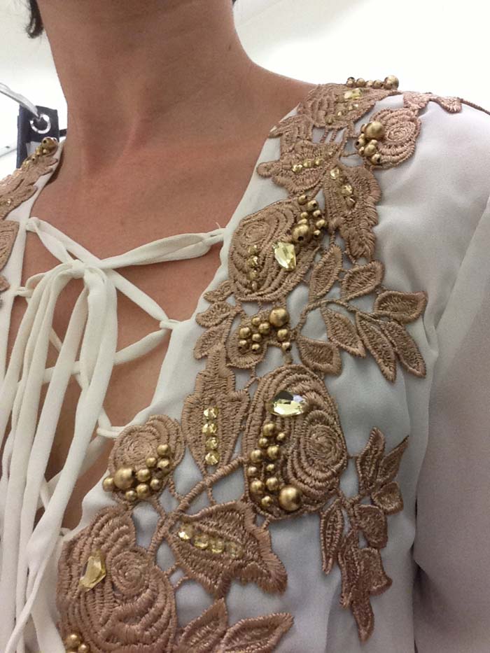 Ai enquanto olhava aquela bagunça, parei e pensei ” Quer saber vou comprar uma camisa com um tecido melhor e fazer um bordado de perolas na gola, manga, vale mais a pena do que perder meu tempo nessa confusão”.