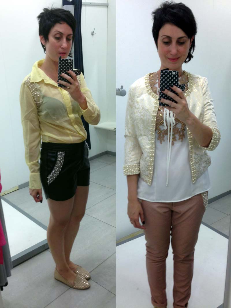 Eu adorei o corte desse short! Mais compridinho atrás, uma graça. Custava 129,90. A camisa era de um tecido bem ruim, detestei, ainda mais por 149,00. Abaixo, com a bata versão branca que curti lá em cima, com o casaqueto estilo chanel bordado. O preto deve ficar melhor, esse dourado com offwhite é meio estranho…ok, feio, rs!