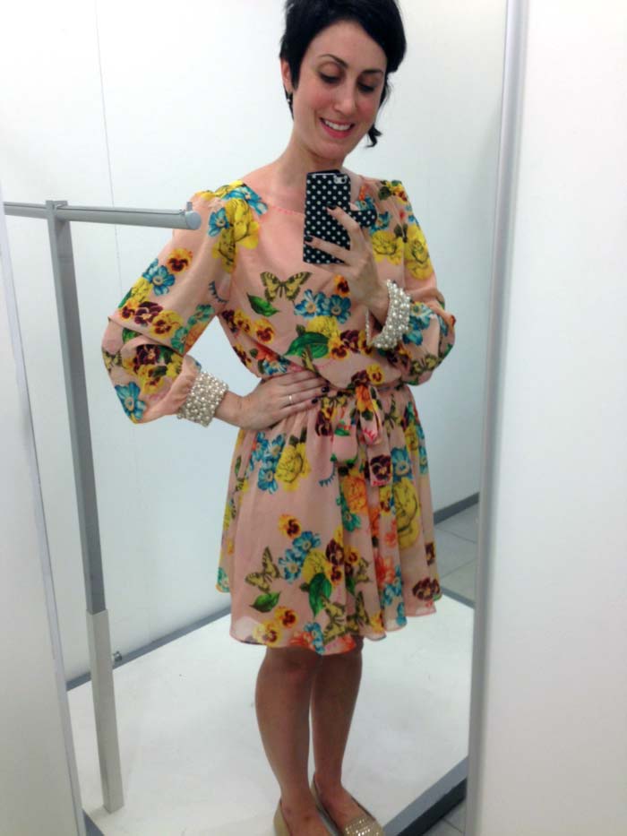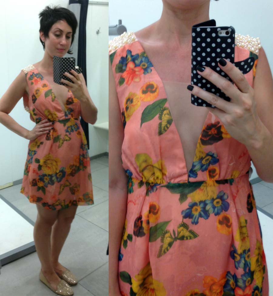 Experimentei o vestido que você gostou, da mesma estampa, mas não tive coragem de pagar, além de que eu sou super baixinha e achei que ele ficou “fofo” demais em mim, muito tecido.