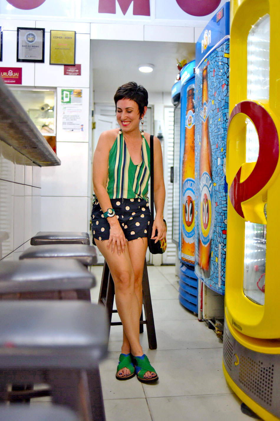 Para compensar, brinquei com o mix de estampas e mantive a mesma cartelas de cores, em tons frios, nos azuis e verdes. Gosto também de usar shorts nas idas aos bares, principalmente em tons escuros, para poder sentar mais à vontade e, se cair alguma comida nele, não deixar rastros das manchas, hehe!