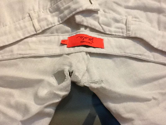 O que vc achou da recente coleção da Daslu para Riachuelo? Tinha peças bem bonitinhas, comprei esta calça de linho que vestiu super bem. O problema é que depois de duas lavagens ela ficou rota no meio das pernas! Pior que eu vesti sem perceber, e ela acabou rasgando durante uma saída minha, olha a situação. Nem me animei a reclamar, mas vou pensar bem antes de comprar de novo na Riachuelo.