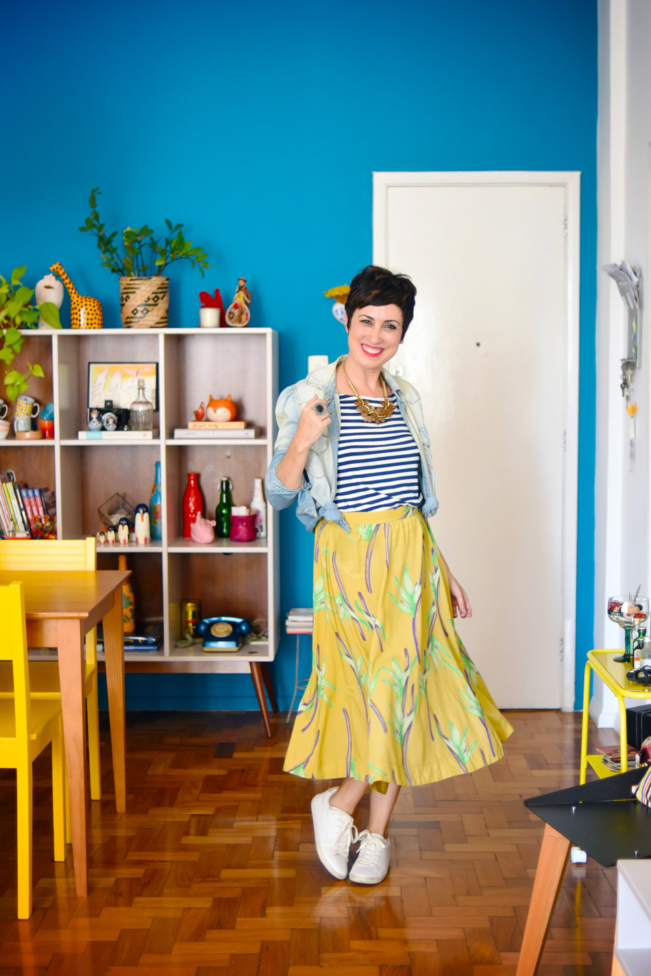 Normalmente é assim: escolhemos uma peça estampada, aí concluímos que todo o resto precisa ser básico neutro quase sem contraste. Não, my friends! Olha aí a padronagem neutra das estampas, as listras, aquelas que vão mesmo com todas as estampas que vocês possam imaginar nessa vida, mandando bem casinha com a estampa da saia! Ainda mais essa blusa que tem banco e azul marinho nos tons, cores bem neutras. 🙂