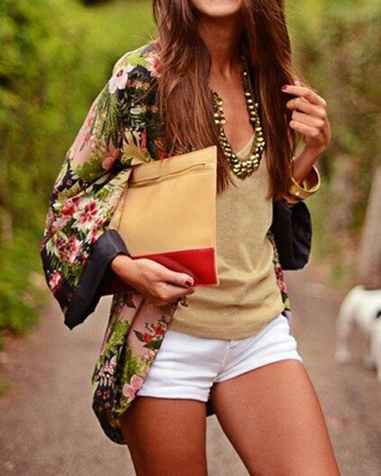 Nessa primeira imagem mesmo dá pra sentir o poder da peça: um look básico de short e regata ganhou força total com a estamp1234odelagem elegante do quimono! 🙂 Arrumada em 5 nanosegundos! Acho que seria um excelente companheiro de viagens!