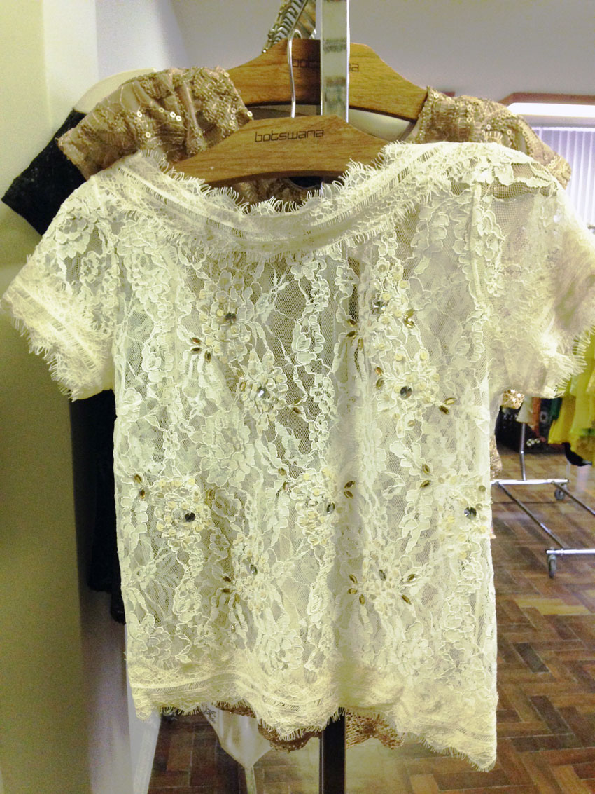 Para entrar na fábrica é preciso tocar a campainha e dizer que está indo pro bazar. A Botswana é uma marca mais voltada para um público jovem, por isso encontramos muuuuitos vestidos com decotes profundos, muitos paetês, saias e shorts mais curtinhos, transparências.