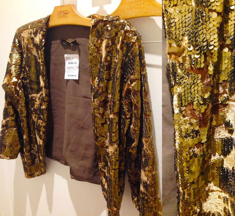 O casaqueto de veludo e paetês tamanho 42 saía em dinheiro pela bagatela de 38 reais!A saia custava 40 reais, mas não vestiu bem. O vestido saía a 80,00, mas à vista era 20% mais em conta. Tinha uma calça por 30 reais, mas um leve puxadinho me fez desistir dela.