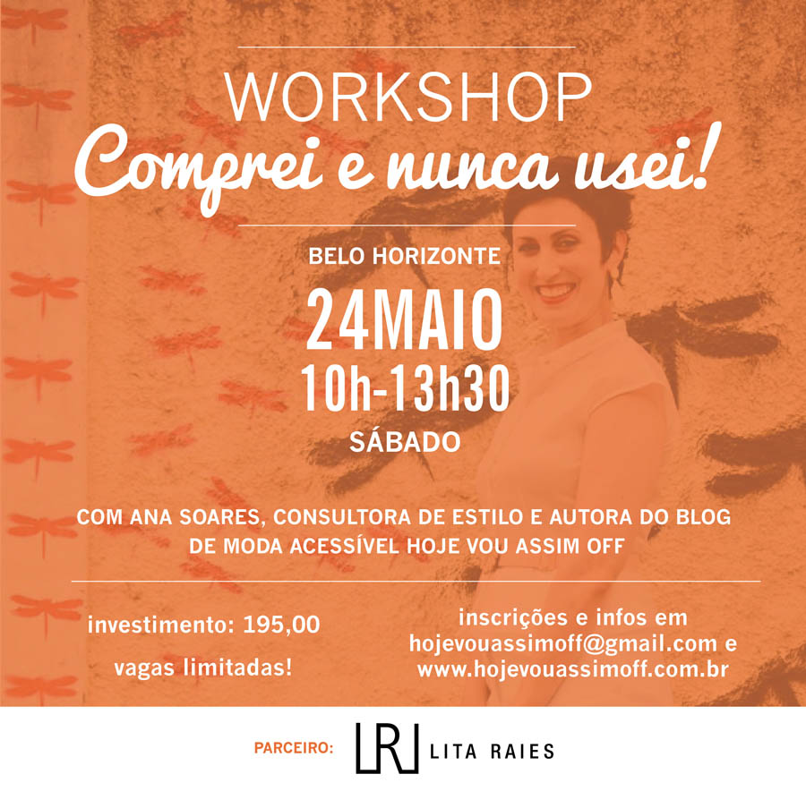 Workshop Comprei e nunca usei – Na seção de mesmo nome do site, eu provoco as leitoras a repensarem suas compras usando peças que comprou por impulso, me forçando a pensar combinações com elas. A tag fez tanto sucesso não só pela ousadia de mostrar os erros e acertos, como pela identificação: quem não tem ao menos uma roupa com etiqueta dentro do armário?