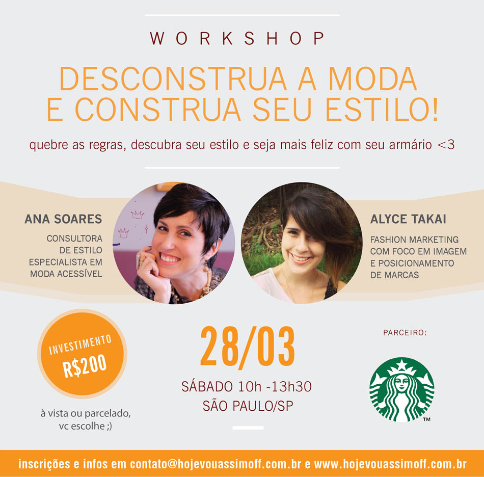 Pois bem, já temos um encontro final do mês em São Paulo! Dia 28 de março, das 10h às 14h, estarei com a mais que querida Alyce Takai, uma super profissional da área de moda com uma bagagem incrível de trabalhos e, principalmente, experiência para falarmos sobre um tema pensado com todo o carinho do mundo: Desconstrua a moda e construa seu estilo!