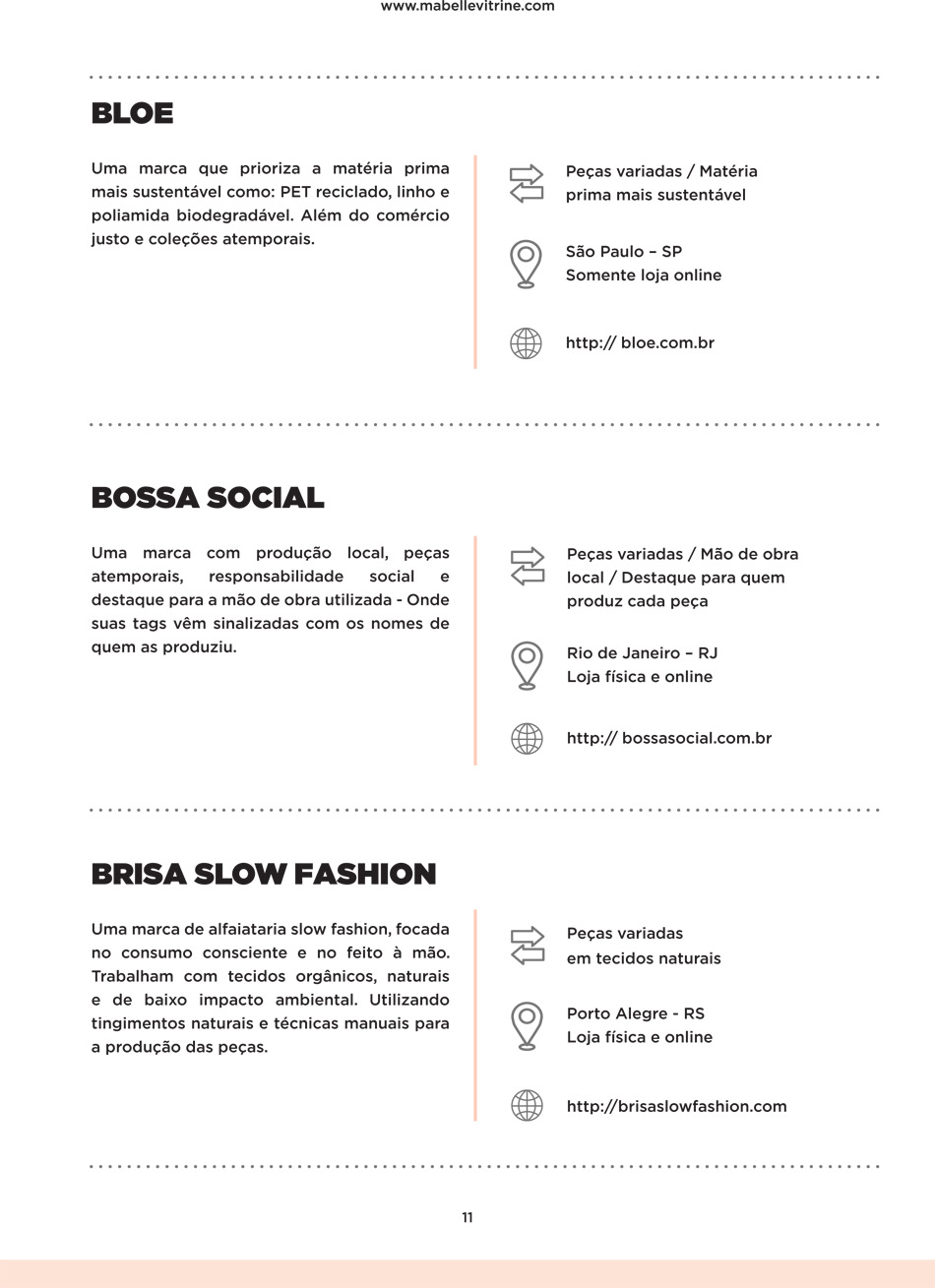 O Guia é dividido em vestuário, moda infantil, cosméticos, market place, acessórios, lingerie, moda praia, sapatos e bolsas, além de textos introdutórios sobre consumo consciente, meios de produção justos, descarte ecológico e política de retorno de resíduos. Tudo bem conciso e fácil de consultar.