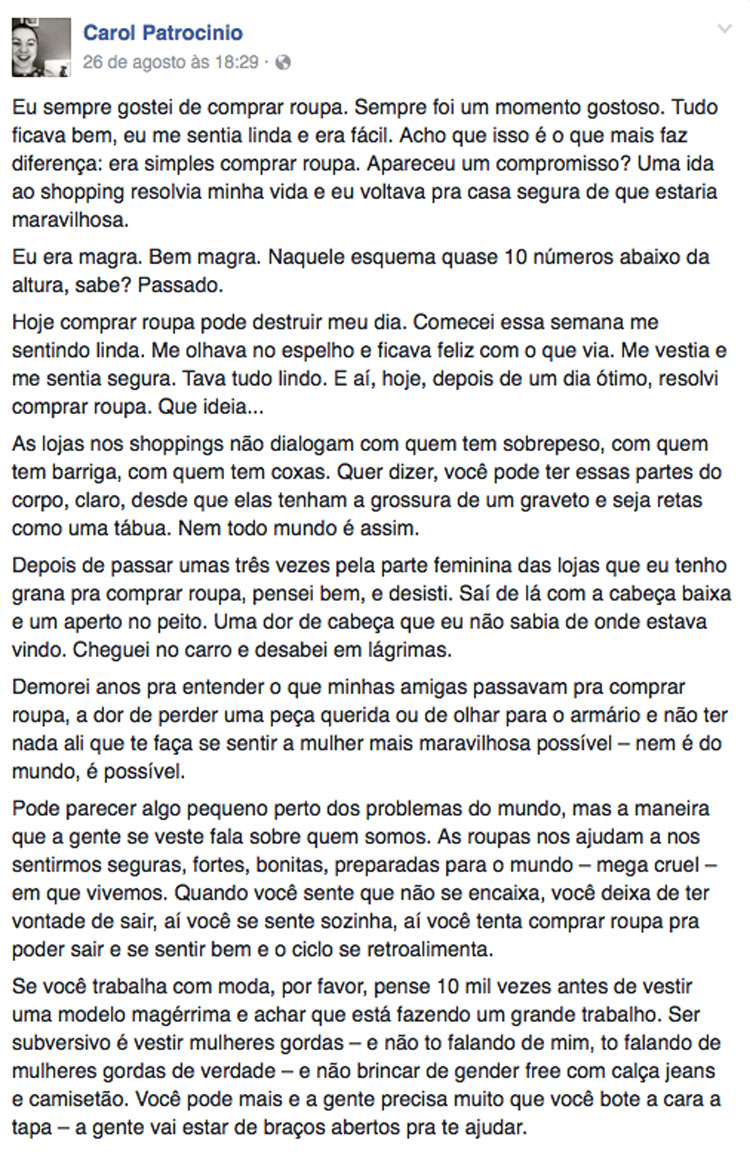 11. Muito interessante o post. Até para quem se “encaixa” no padrão – sou alta e magra – fica difícil sabia? Não sou magrinha, tenho perna grossa, apesar de passar uma imagem longilínea. Eu visto tamanho G em algumas lojas, como Farm, Dress To e Blue Man. Oi?! Então como se sente uma pessoa que realmente precisa de um tamanho maior? É loucura pensar que uma experiência tão gostosa – a de comprar roupa nova – possa se tornar um momento de tristeza.