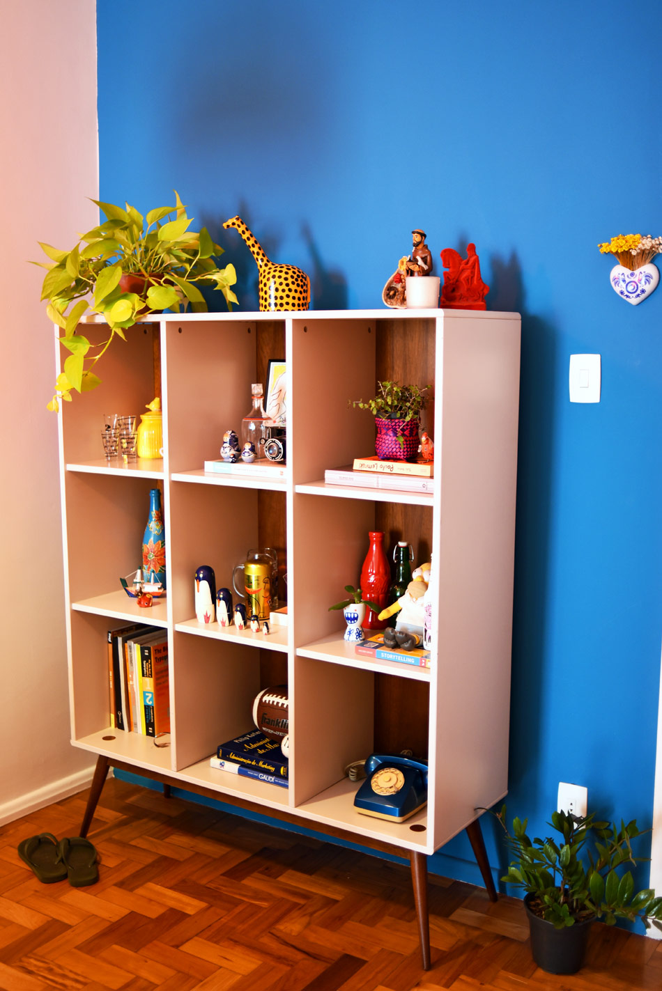 O vaso de coração é da Tok&Stok; a estante de pé palito é da Oppa e ficou durante anos com os objetos dispostos de qualquer maneira. Nós adoramos trazer algumas miudezas de viagens como lembrança, mas não fazíamos ideia de como deixar tudo com uma carinha mais de Pinterest, hahahaha! A Carol foi quem dispôs todos eles de acordo com temas em cada nicho.