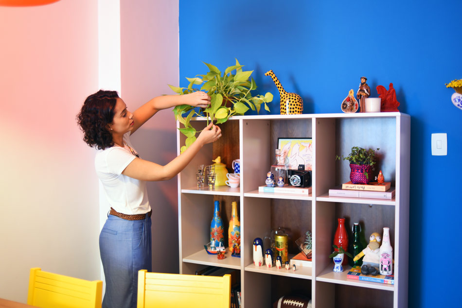Minha sala já estava com praticamente todos os objetos, com a parede pintada de azul netuno, só que tudo estava muito desconexo: eu não fazia ideia de como dispor todos os nossos badulaques. Mas eu sabia que queria uma sala extremamente colorida e irreverente, bem a minha cara, para receber nossos amigos com muita alegria.