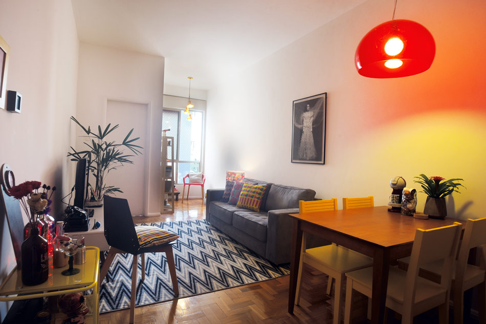 A mesa lateral de madeira foi doação da minha amig1234uminária é da Oppa. O carrinho de bar foi sugerido pela Carol, e eu o encontrei na Adoro Adorno, na Fábrica Bhering, por ótimos R$180!