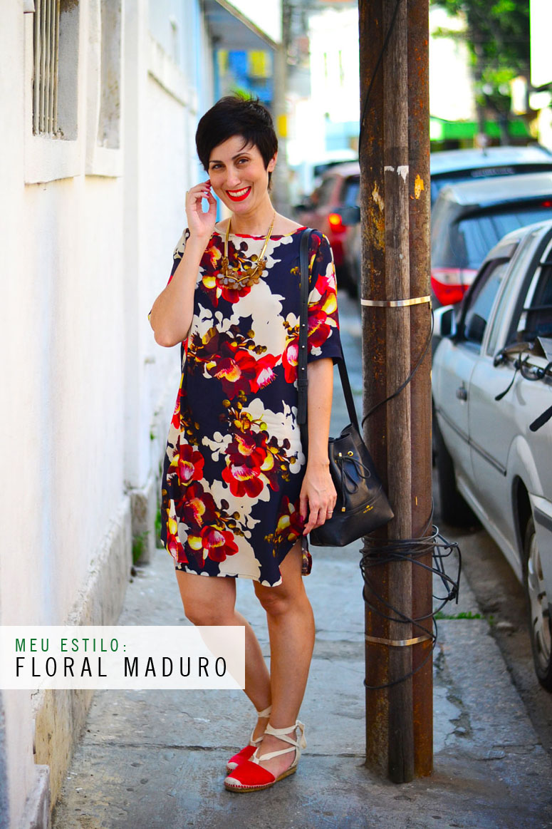 Look de 2015 mostrando o tipo de floral que mais me identifico: estampa grande, quase agressiva, fundo escuro, flores pouco delicadas e cores fortes.