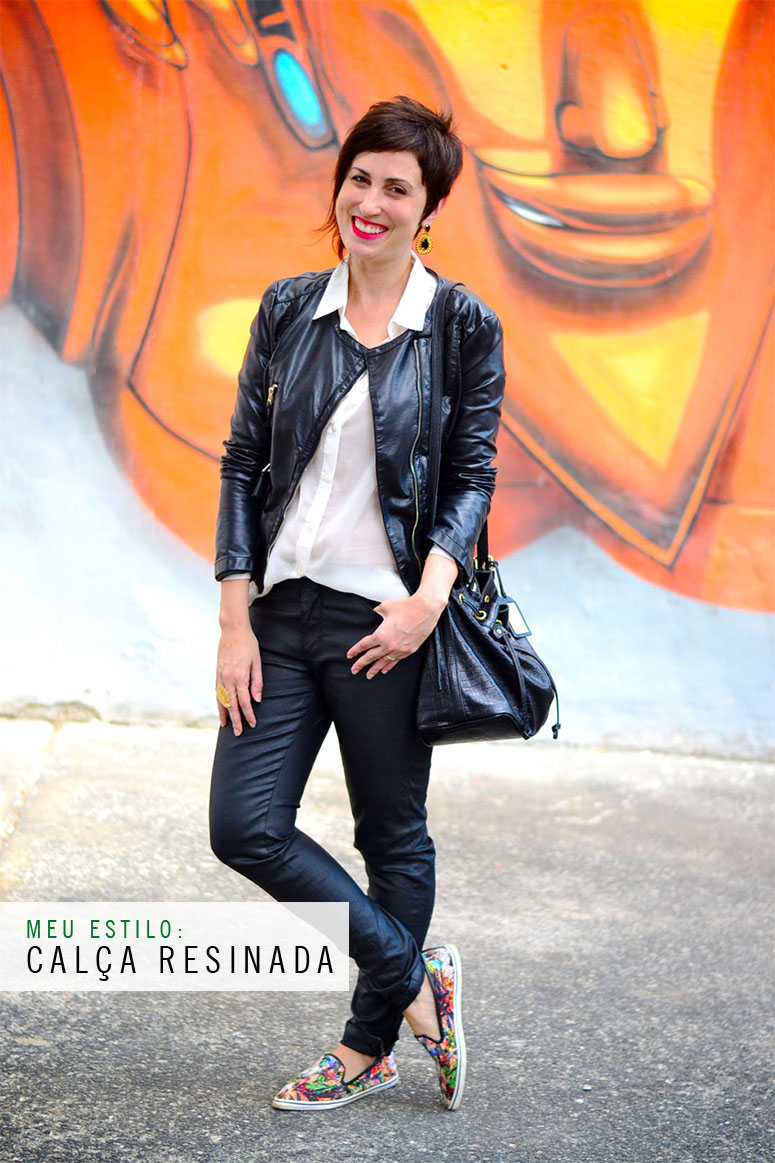 Eu até uso floral, mas tem que ser mais estilizado ou mais maduro, de preferência com fundo escuro. Prefiro o pesado ao delicado. Nesse look mais atual, de 2015, eu mostro exatamente o estilo que eu gosto de usar: ainda a jaqueta, com camiseta ou camisa, sapato mais pesado e baixo e calça resinada. Preciso de geometria ou de texturas diferentes, gosto de peças mais dramáticas que açucaradas – isso tudo pro meu estilo, deixando bem claro.