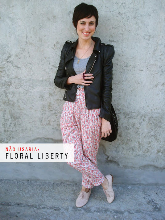 Um exemplo do que eu usava nos idos de 2011, 2012: calça com pregas e estampa micro floral, ou liberty. Foi das minhas poucas peças com esse tipo de estampa (que era a maior moda na época) e em pouco tempo eu passei pra frente. Um dos indicativos que ela não tinha nada a ver comigo foi ter tentado quebrar a sua doçura com uma jaqueta preta e um sapato de inspiração masculina, mesmo sendo rosê (nessa época começaram a surgir os oxfords por aqui também!).