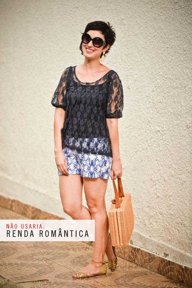 Outra foto mais antiga, de início de 2014, com uma blusa de renda comprada na C&A. Eu não gosto desse look porque reúne todos os elementos que eu não usaria mais hoje em dia, uma blusa com estilo mais romântico e um short com a estampa-febre na época, o azulejo português. Acho que bati a cabeça na hora de comprar esse short, porque essa estampa não tinha nada a ver comigo! hahaha