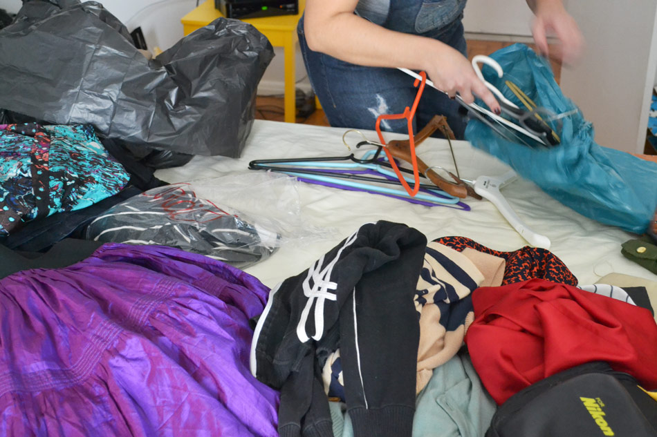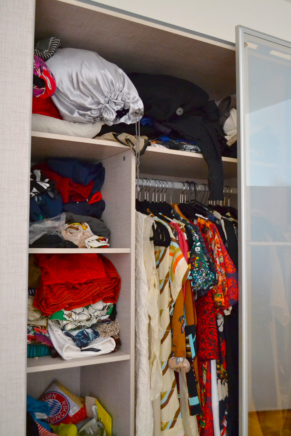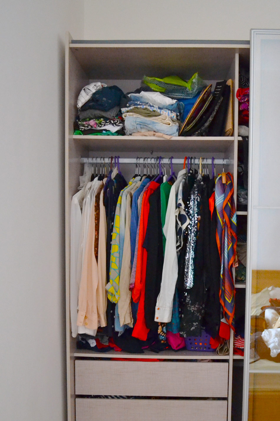 Como tenho dois gatos brancos, tentava acondicionar as peças escuras em sacos de tecido para protegê-las dos pelos, mas nunca lembrava o que guardava ali; roupas que eu usava com alguma frequência em áreas mais altas, dificultando o acesso (e, assim jogava todas de volta); saias e bermudas dobradas e socadas em cubos por falta de espaço.