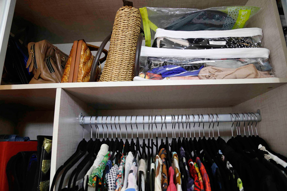 Para me arrumar, nem se compara: hoje eu levo, no máximo, 5 minutos para escolher a roupa do dia. Sem caô, eu vejo na hora as peças, já pego e pronto! Nunca mais precisei tirar pilhas e pilhas de dentro do armário, procurando algo.