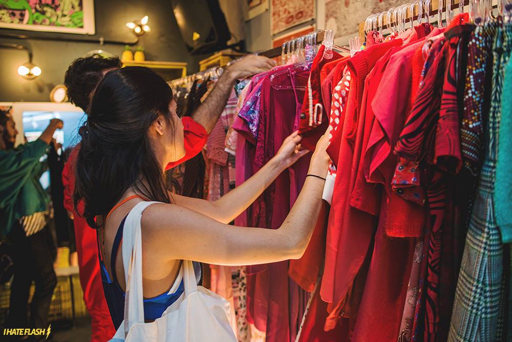 São aproximadamente 100 brechós expondo suas peças. As meninas levam cada uma duas araras e podemos encontrar de tudo lá.
