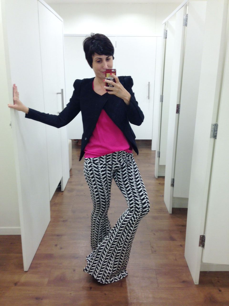 Esse de oncinha vestiu perfeito! Adorei o caimento também, mas nã1234eu estilo. Se não me engano, também custava 300 ou 249,00. O blazer tinha preto e rosê além desse vinho, material bem grosso, meio elanca+neoprene, bem estruturado e bem acabado, mas até ele tinha que ser M, o P me apertou – e custava 350,00, nesse calor do Rio inclusive no inverno, não teria chance…