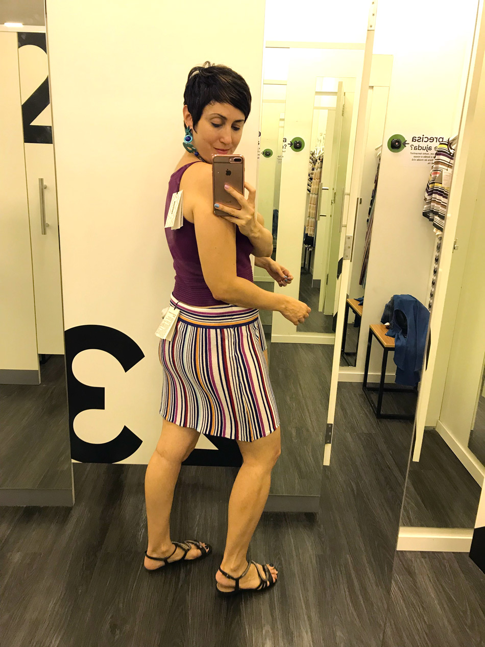 Essa saia mais curta, de tricô de máquina, não tem forro, é muito mais fininha, o que marca mais a silhueta. Não gostei do caimento.