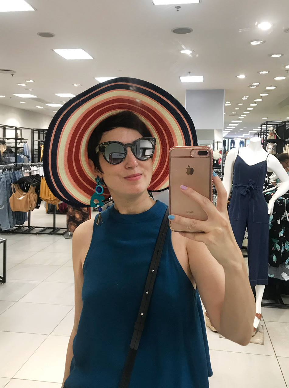 Tinha também moda praia, que eu não provei, não tive tempo. 🙁 Masssssss eu AMEI a viseira! Achei chic, coisa fina, de verdade e combinou comigo, hahahaha! Essa custava 90 reais.