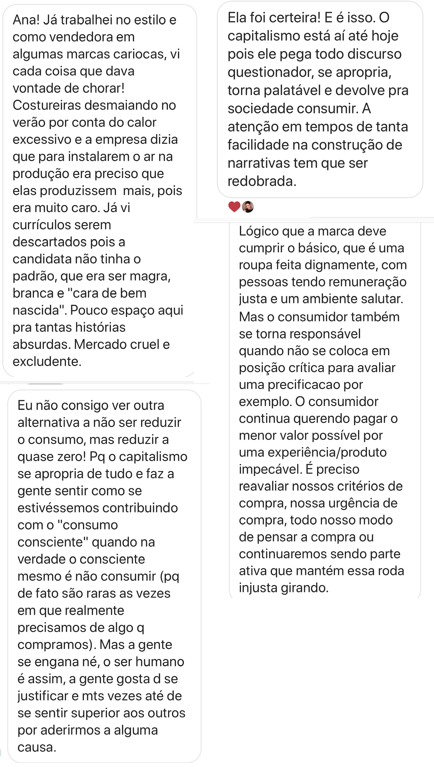 Num mar de egos de blogueiras obsessivas por esfregar na cara da sociedade como são ricas e privilegiadas com roupas que pessoas assalariadas nunca conseguirão comprar, você é uma ilha de criticidade e empatia, Ana.