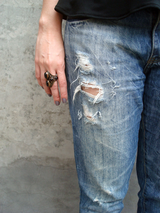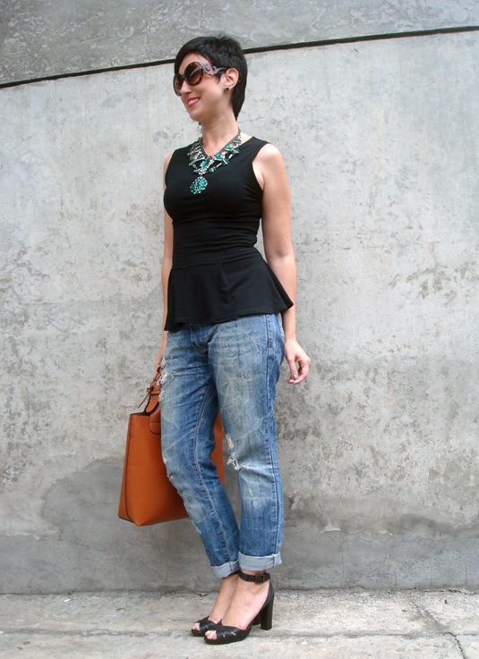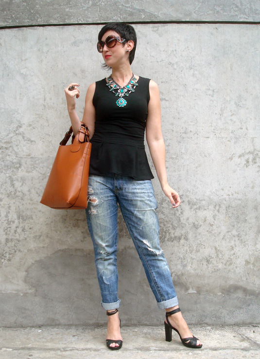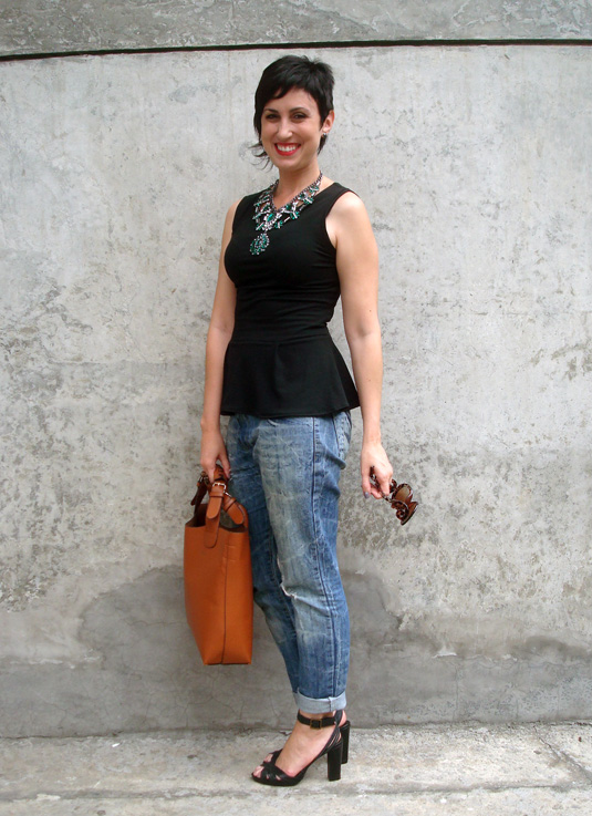 Optei então por uma roupa mais discreta e básica por conta do acessório, já que o evento era vespertino e eu não queria nada muito over. Obviamente eu pensei até numa blusa de oncinha com ele, mas eu quis primeiro começar por algo mais básico. Para isso mandei ver na blusinha peplum (para criar a ilusão de uma cintura, acho que consegui, hã? claro que ignorei o volume nos quadris, rs) e no jeans boyfriend rasgado, que fez esse contraponto com o brilho-luxo-poder-e-sedução do maxi colar. Já que esse jeans poderia achatar minha silhueta, não pensei duas vezes e subi nas tamancas no salto!