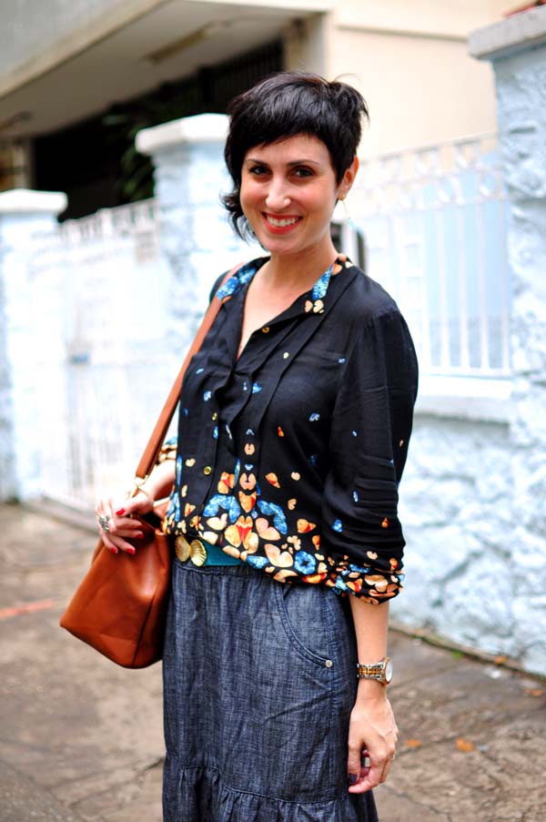 Fui resolver algumas coisas rapidinho na rua, por isso pensei em um look tranquilo. Minha peça favorita para os dias em que não quero pensar muito é essa saia longa jeans! É prática e não fico esculhambada (hahaha) mesmo se eu fizer muita força, rs! A camisa de borboletas é minha outra paixão: incrível como me sinto arrumada com ela sem precisar queimar neurônios pensando em coordenação de looks.